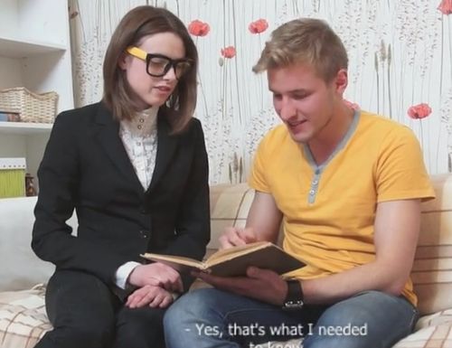 Находчивый пикапер подсел на лавочке к милой студентке в очках, которая готовилась к диссертации по начертательной геометрии. Не долго думая умник начал покатывать шары и разводить институтскую девушку отличницу на разговор, а чтобы очкастая красотка наверняка клюнула, наврал ей, что хорошо разбирается в начерталке и даже дома имеет много полезных книг по ней. Наивная умница заинтересовалась его домашней коллекцией литературы настолько, что согласилась пойти к незнакомому парню в гости, где он её раскрутил на интим, раздел и трахнул, а потом забрызгал спермой очки, которые русская красавица забыла снять.