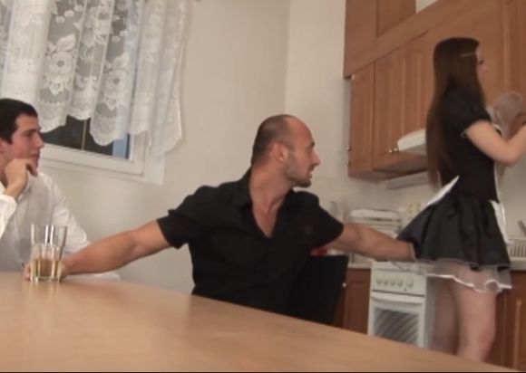 Отдыхая в гостях похотливый бисексуал положил руку на попку хозяйственной молодой жены друга, которая мыла посуду. Его приятель был не прочь таких сексуальных домогательств к своей девушке в костюме горничной и вскоре сам присоединился к мануальным ласкам её красивой жопы, готовясь со своим товарищем и супругой устроить групповой би секс на кухне. К таким шалостям красивая сексвайф была готова. Прекрасно зная половую ориентацию своего парня, женушка дала ему первому взять за щеку и пососать член гостю, ну и ему минет сделала, чтобы возбудить перед тем, как начать нетрадиционный трах. Вначале мужчины с двух сторон трахали красотку, потом взялись друг друга в жопу ебать, в чём она им активно помогала, а под конец тройничка бисексуальное мжм трио стало кончать кто как может, даже хозяину дома сперма в рот попала.