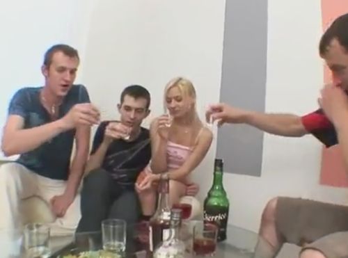 Групповая русская ебалка с молодой подругой-ебухой в полосатых гольфах, которую парни споили водкой и трахнули на троих. После нескольких бутылок крепкой выпивки бухая блондинка была не хозяйкой своей пьяной пизде, куда беспомощную девушку-алкоголичку ебли весёлые ребята. Изредка приходя в сознание 18-летняя ебаная блядь со стройным телом и красивым лицом покорно брала за щеку у трёх друзей, коим нравилось её пялить толпой, да пускать по кругу, как последнюю конченую шлюху, готовую на всё. Завершением домашней порнухи стали камшоты от пацанов, спускающих сперму на личико белобрысой давалки.